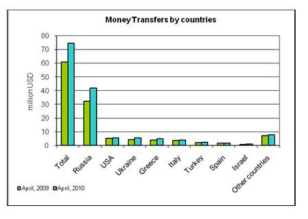 In April 2010 the volume of money transfers from abroad constituted 74.7 million USD, which is 14.1 million USD or 23.2 percent more than the same amount for April 2009. During this period the volume of remittances significantly grew for Russia (by 9.7 million), Ukraine (by 1.3 million) and Greece (by 1.0 million), as well as for several other countries.