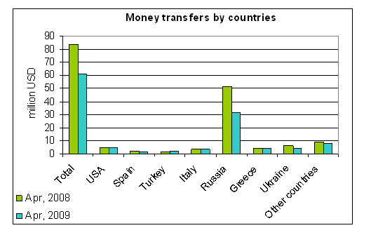 In April 2009 the volume of money transfers from abroad constituted 60.7 million USD, which is 22.9 million USD or 27.4 percent less than the same figure for April 2008. The decrease of overall volume of remittances is mainly due to their decrease from Russia by 19.2 million USD or 37.5 percent. The volume of remittances also decreased for Ukraine (1.9 million USD or 31.2 percent decrease), Armenia (1.7 million USD or 70.9 percent decrease), Spain (0.6 million USD or 27.4 percent decrease), as well as for some other countries.