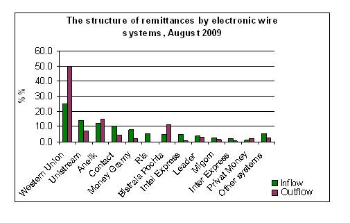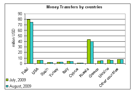 In August 2009 the volume of money transfers from abroad constituted 75.0 million USD, which is 4.4 million USD or 5.6 percent less than the same amount for the previous month. The decrease of overall volume of remittances is mainly due to their decrease from Russia by 3.2 million USD or 7.5 percent. The volume of remittances also decreased for Ukraine, Italy and Turkey – 0.3 million USD each or 4.0, 8.3 and 13.0 percent decrease respectively.