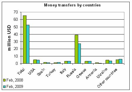 In February 2009 the volume of money transfers from abroad constituted 52.4 million USD, which is 12.9 million USD or 19.8 percent less than the same figure for February 2008. The decrease of overall volume of remittances is due to their decrease from Russia by 12.1 million USD or 30.9 percent. Remittances from other countries remained on about the same level.