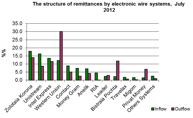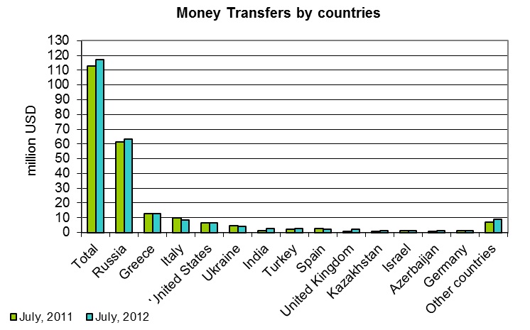 92.4 percent of total money transfers from abroad fall on those 13 big donor countries, from which the volume of such transfers exceeded 1 million USD in July. In July 2011 the share of these 13 countries constituted 93.7 percent of the total volume of money transfers.