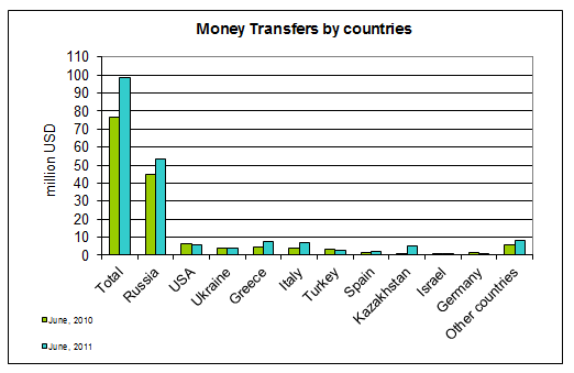 In June 2011, the volume of money transfers from abroad constituted 98.9 million USD, which is 22.1 million USD or 28.7 percent more than the same amount for June 2010. During this period, the volume of remittances grew from Russia (by 8.8 million), Kazakhstan (by 4.8 million), Greece (by 3.3 million), Italy (by 3.0 million), as well as for several other countries.
