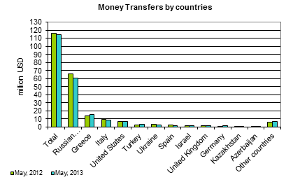 In May 2013, 12.2 million USD (or 20.0 million GEL) were transferred from Georgia instead of 9.0 million USD (or 14.6 million GEL) in May 2012.
