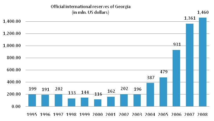 Despite the fact that in 2008 Georgia suffered two external shocks (which correspondingly had negative effects on the Georgian economy), the country completed the year 2008 with highest end-of-year level of International Reserves.