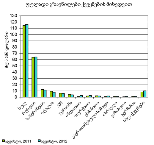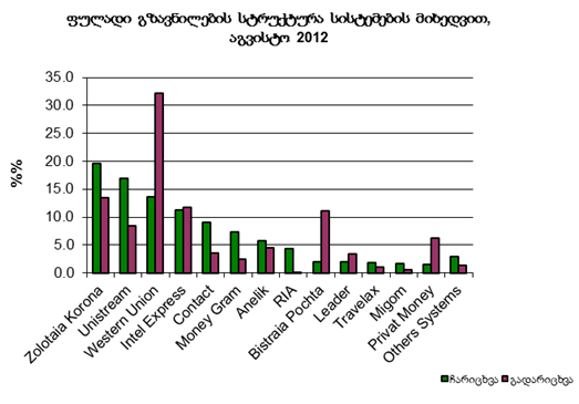 2012 წლის აგვისტოში საქართველოდან საზღვარგარეთ 8.9 მლნ აშშ დოლარი (14.7 მლნ ლარი) გადაიგზავნა, ნაცვლად 8.6 მლნ აშშ დოლარის (14.2 მლნ ლარი) გასული წლის აგვისტოში.