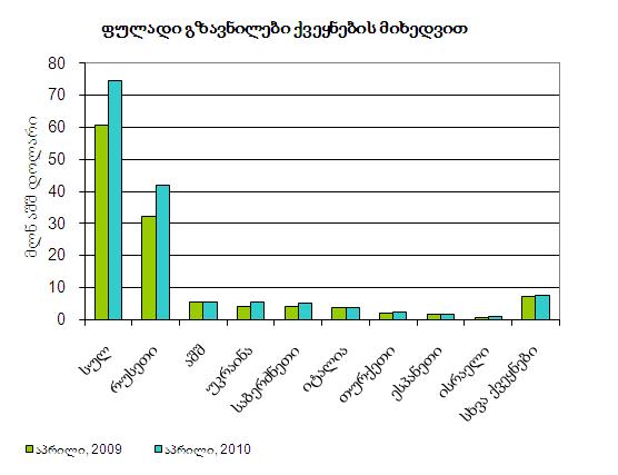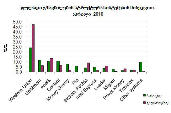 2010 წლის აპრილში საქართველოდან საზღვარგარეთ 6.5 მლნ აშშ დოლარი გადაიგზავნა, ნაცვლად 5.8 მლნ აშშ დოლარისა გასული წლის აპრილში.