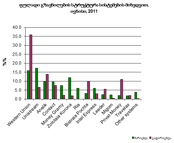 გასული საანგარიშო თვის განმავლობაში განხორციელებული ფულადი გზავნილების სტრუქტურა გრაფიკულად, ანგარიშსწორების სისტემების მიხედვით, მოცემულია ქვემოთ: