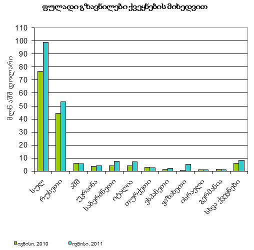 2011 წლის ივნისში ქვეყანაში შემოსული ფულადი გზავნილების ნაკადების მოცულობამ 98.9 მლნ აშშ დოლარი შეადგინა, რაც 22.1 მლნ აშშ დოლარით, ანუ 28.7 პროცენტით მეტია 2010 წლის ივნისის ანალოგიურ მაჩვენებელზე. ამ პერიოდში ფულადი გზავნილების მოცულობა გაიზარდა რუსეთიდან (8.8 მლნ აშშ დოლარით), ყაზახეთიდან (4.8 მლნ აშშ დოლარით), საბერძნეთიდან (3.3 მლნ აშშ დოლარით), იტალიიდან (3.0 მლნ აშშ დოლარით), აგრეთვე ზოგიერთი სხვა ქვეყნიდან.