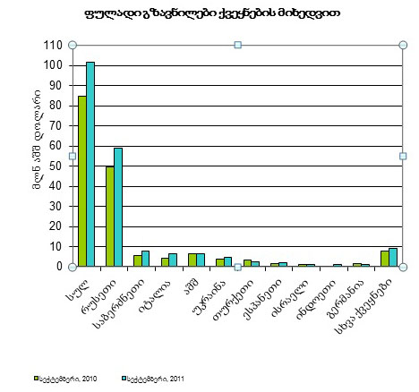 2011 წლის სექტემბერში საქართველოდან საზღვარგარეთ 7.4 მლნ აშშ დოლარი (12.3 მლნ ლარი) გადაიგზავნა, ნაცვლად 7.2 მლნ აშშ დოლარის (13.3 მლნ ლარი) გასული წლის სექტემბერში.გასული საანგარიშო თვის განმავლობაში განხორციელებული ფულადი გზავნილების სტრუქტურა გრაფიკულად, ანგარიშსწორების სისტემების მიხედვით, მოცემულია ქვემოთ: